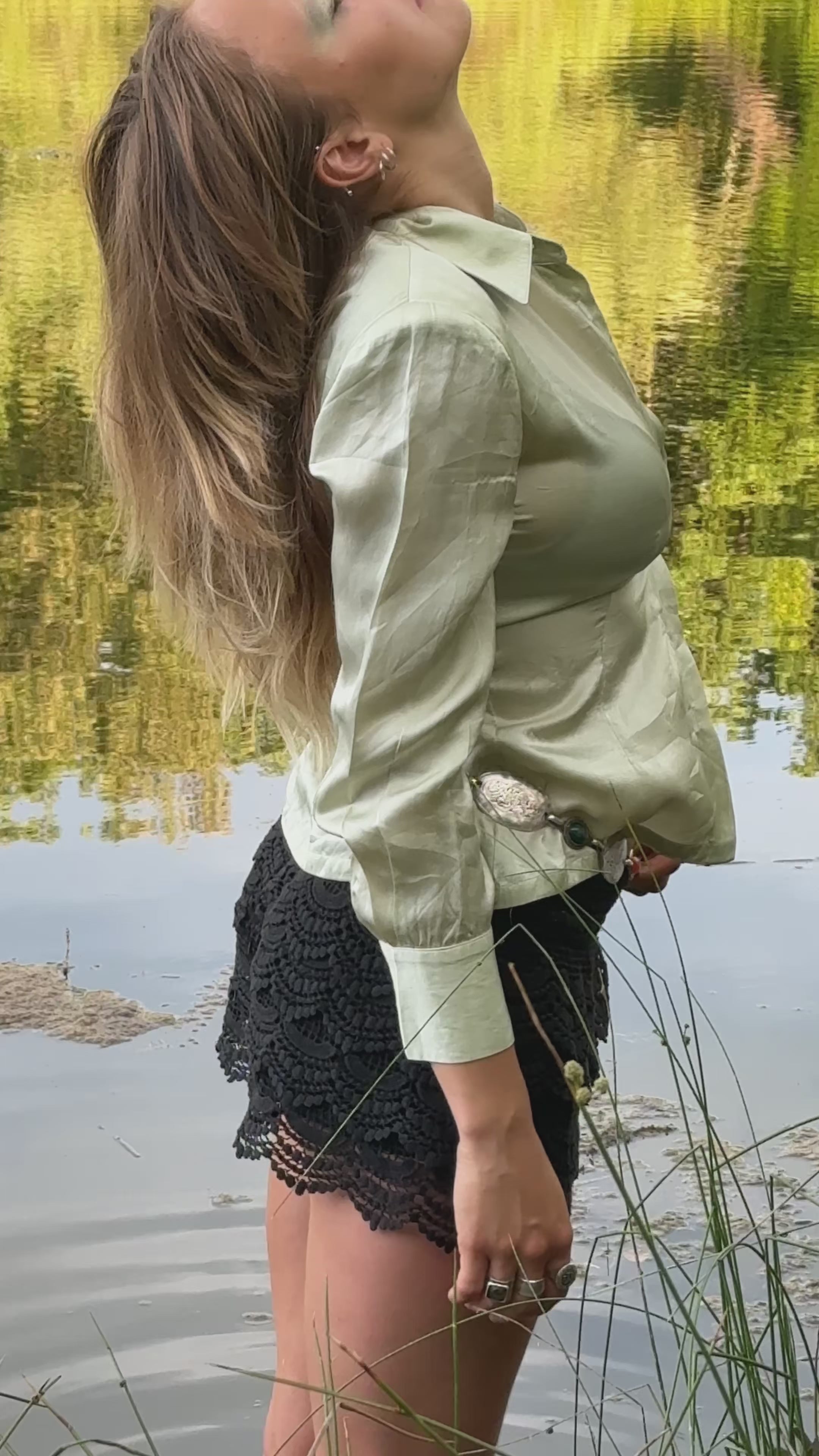 This one-of-a-kind Italian vintage shirt is crafted from pure silk in a luminous sage-green tone that shifts beautifully in the light. Reworked and tailored in Florence, it features subtle shoulder pads that give it a structured, elegant shape while still allowing for natural drape.