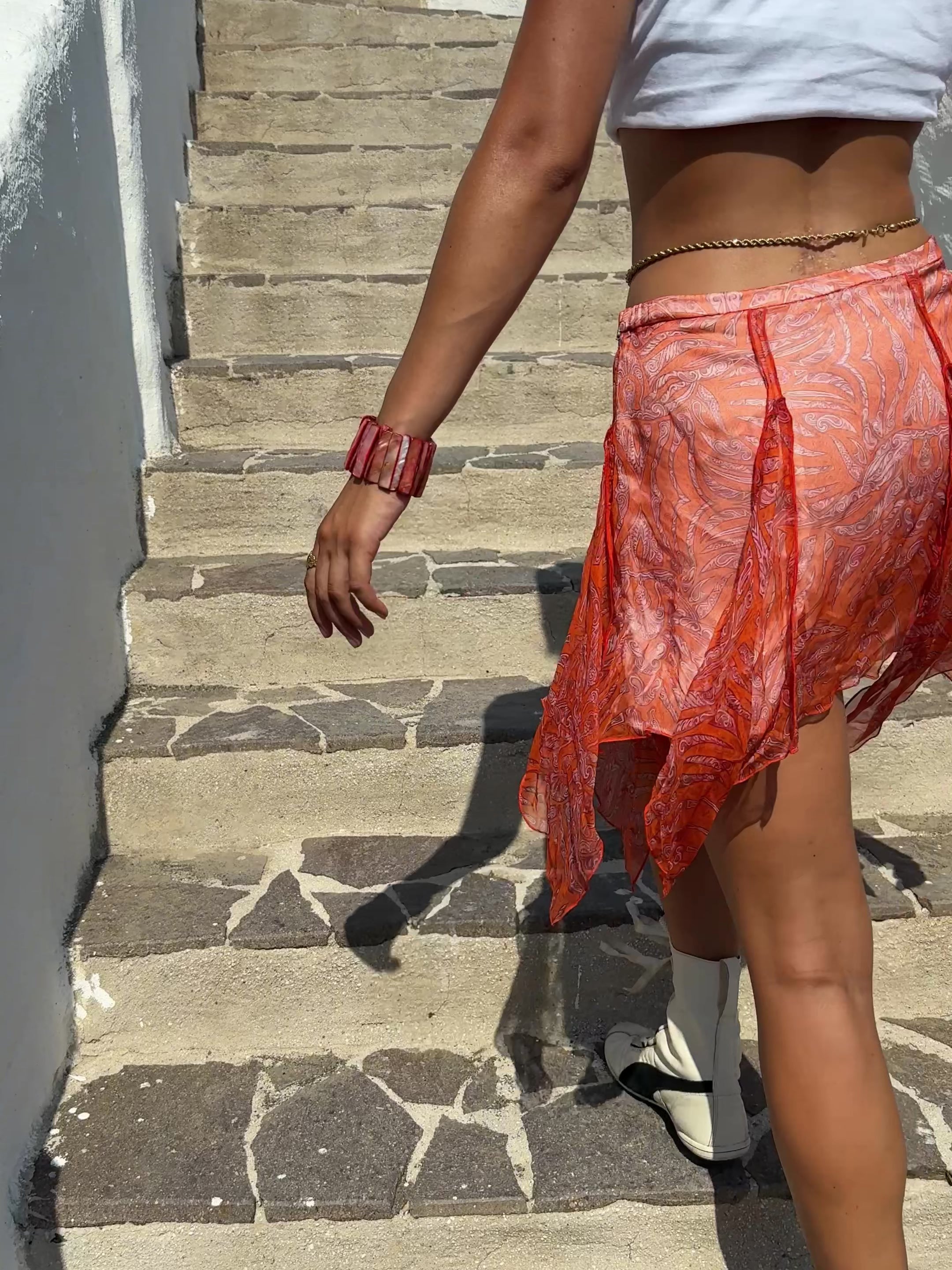 Its vibrant coral-orange paisley-inspired print enhances the skirt’s free-spirited character. Versatile and statement-making, it can be worn as a chic beach cover-up, styled with boots for festival looks, or dressed up for warm summer evenings.