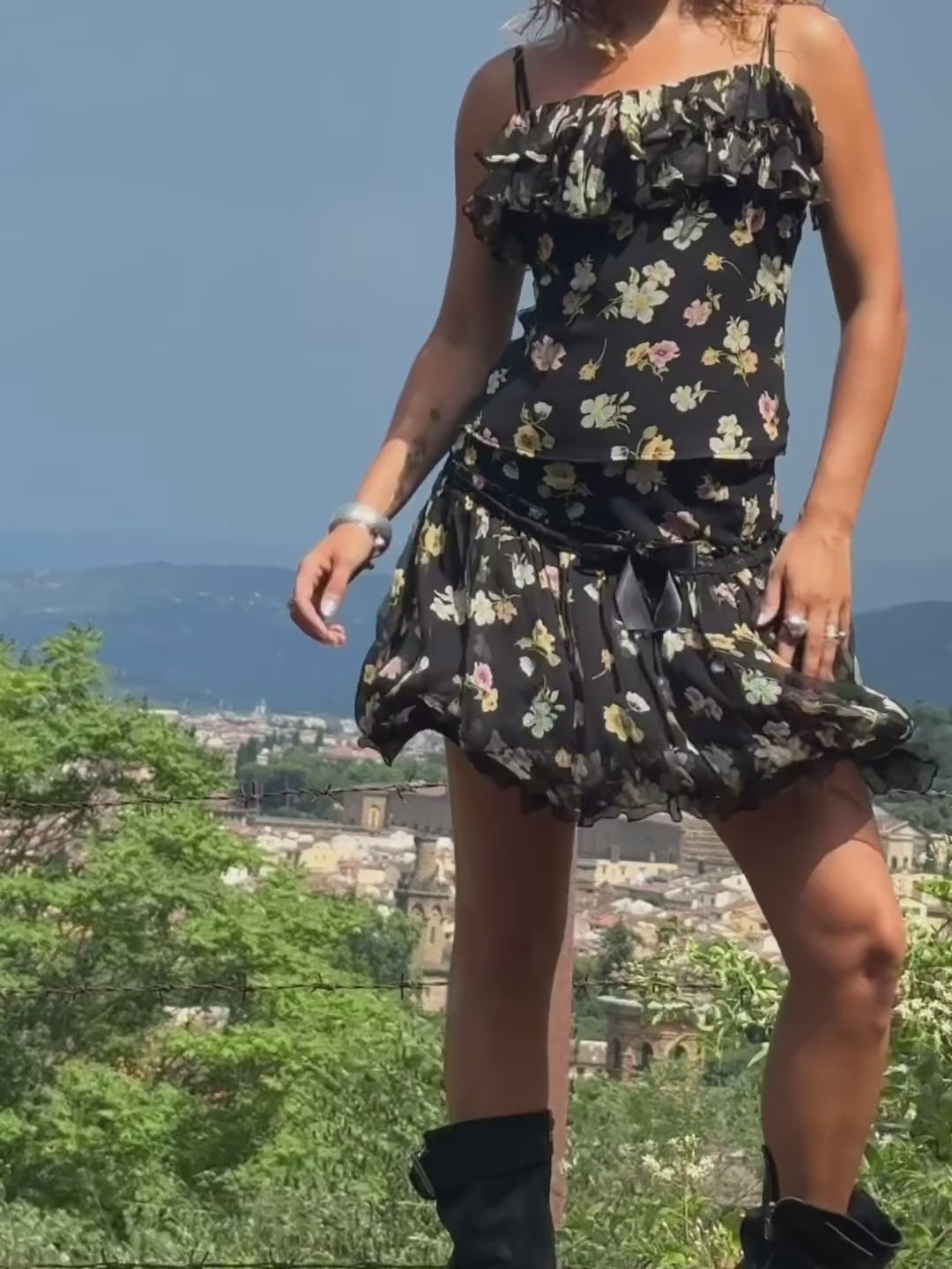 This Italian vintage matching set by Louisa Spagnoli is crafted from 100% pure silk in black with an elegant floral motif. The co-ordinating top and skirt create a timeless two-piece ensemble that can be styled together or worn separately for versatile looks.